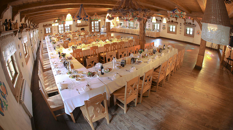 Chata góralska jest bardzo czarująca ale: przez antresolę, która jest na szerokość sali oraz jej wielkość osoby wysokie (1,90m) mogą walić się w głowę przy wstawaniu z krzesła. Wejście do sali jest dość niskie i ma duży stopień. Osoby które mają problemy z chodzeniem (zwłaszcza mam tu na myśli osoby starsze) mogą mieć problem z wejściem lub wyjściem z sali. Dlatego my tą salę od razu odrzuciliśmy. Jest to sala na około 60 osób.